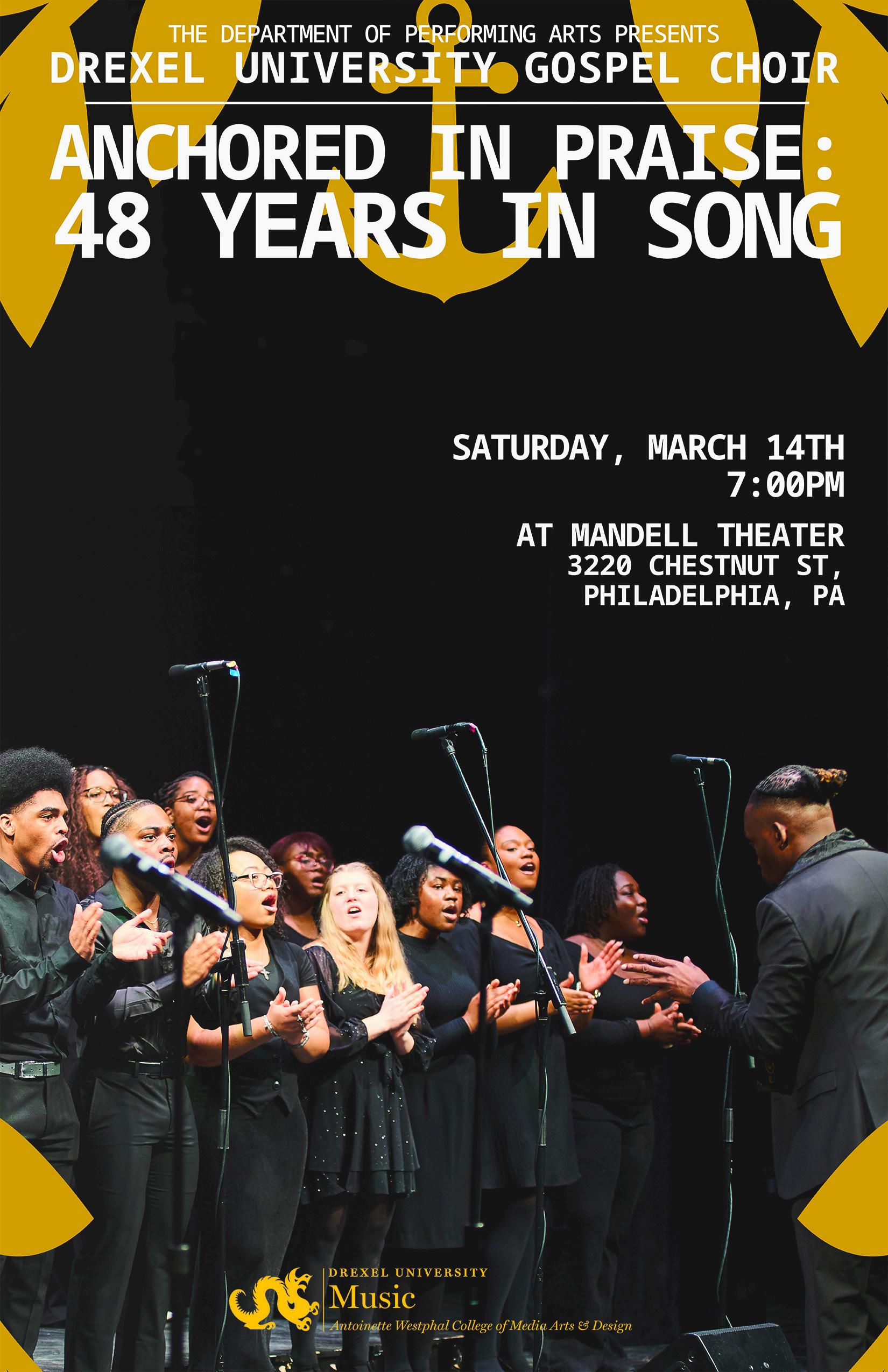 The Drexel University Gospel Choir is an open group that performs contemporary gospel music. No audition is required and all interested singers are encouraged to join. The group performs frequently in churches throughout the Delaware Valley.