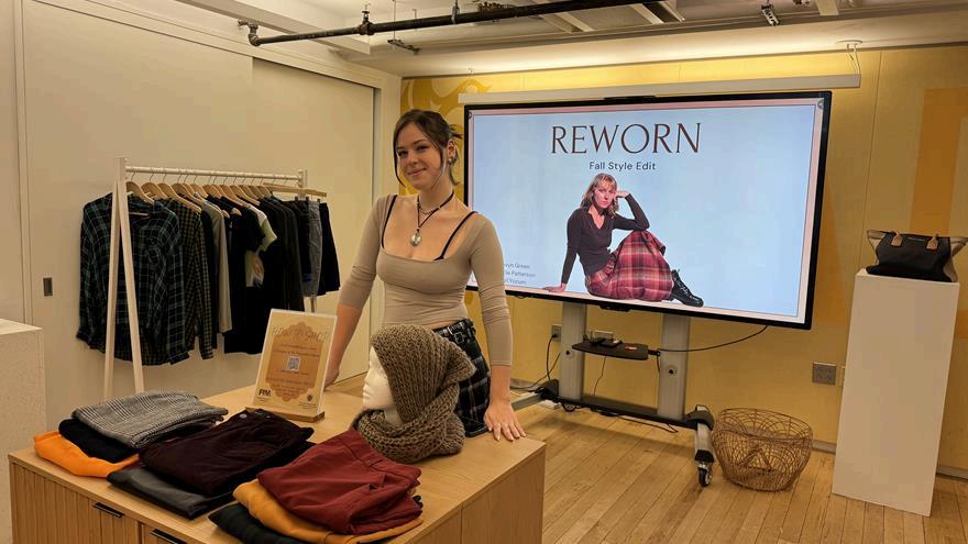 Patterson runs the day-to-day business of Reworn as an independent study student and is currently working on making it into an ecommerce space. Chris Baeza, associate program director and assistant teaching professor in fashion industry & merchandising, encouraged her to take on Reworn She’s created new graphics for the store and organized a photoshoot featuring clothes from the fall collection styled on students from around Westphal