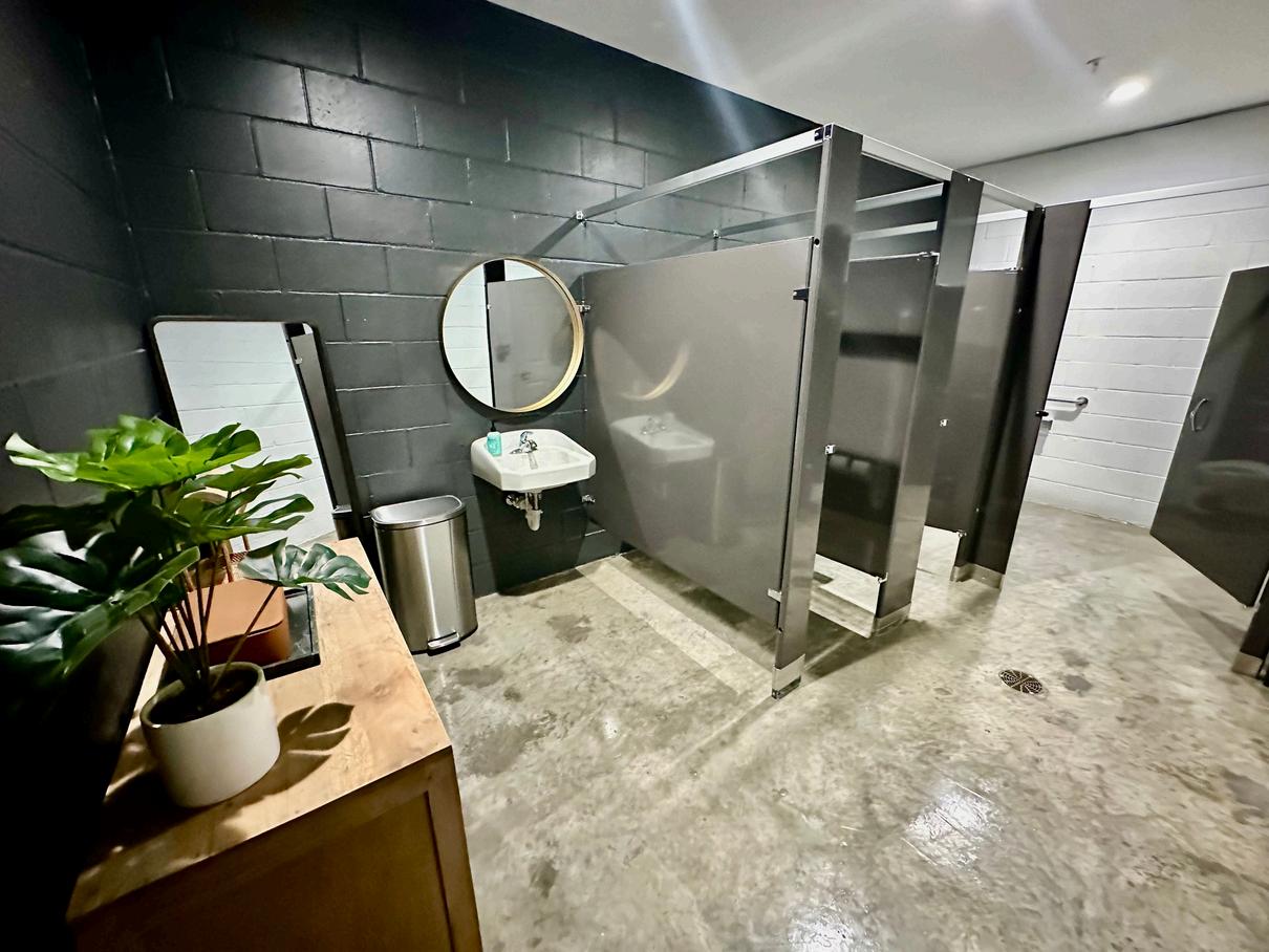 The Venue ceilings are 33ft at the peak with 20 ft eaves on the side and has 7 15ftx12ft full view glass doors around the building letting in lots of natural light and a super cool feel. The wood panels acoustic accent wall also presents a vibe. Clients who need a large space for a wedding, conference, concert or the like can go big here! It is the largest air conditioned event space on 30A.