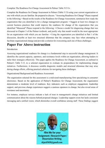 Complete The Readiness For Change Assessment In Palmer Table