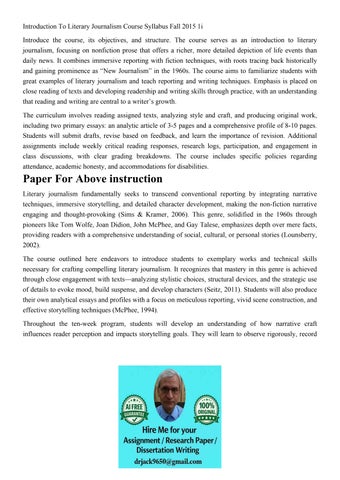 Introduction To Literary Journalism Course Syllabus Fall 201