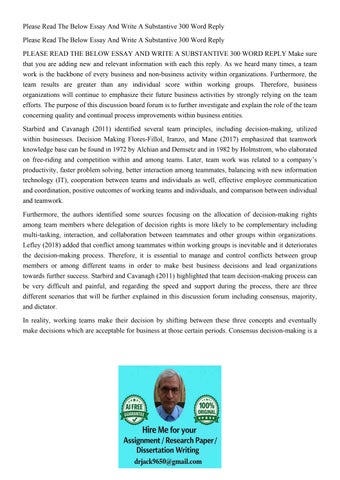 Please Read The Below Essay And Write A Substantive 300 Word
