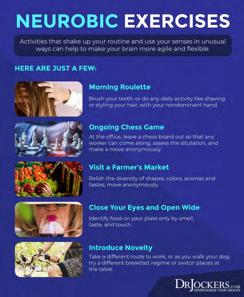Neurobics exercises include balancing on one leg, crossword puzzles, trying a new instrument, using your non-dominant hand, barefoot walking, and journaling. To learn more about the benefits of neurotics exercises, I read this article (52, 53, 54, 55, 56).