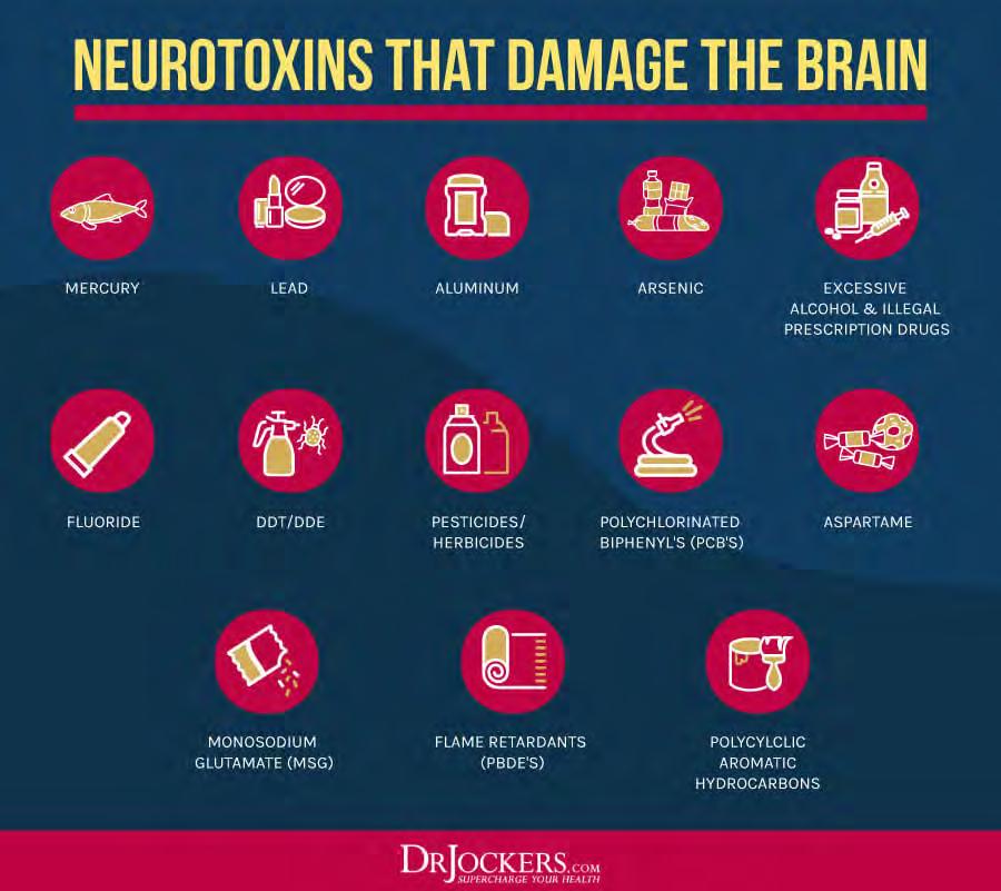 Neurotoxins, such as ethanol (in alcohol), glutamate, mycotoxins, nitric oxide, botulinum toxin (in Botox), tetrodotoxin, and tetanus toxin, are particularly damaging to your neurological functioning. Environmental toxicity may lead to memory problems, brain fog, dementia, neurodegenerative diseases, mood swings, irritability, fatigue, anxiety, depression, and mental health issues (21, 22, 23).