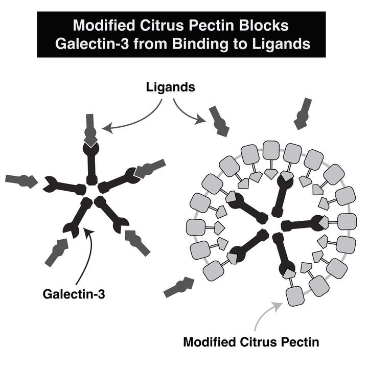 Unlikepectin,thesemodifiedmoleculesaremuch,muchsmaller:3–13 kilodaltons, compared to the 200–300 kilodaltons of regular pectin. The smaller-sizedmoleculesallowthecompoundtoenterthebloodstreamthrough thedigestivetract.Oncethere,becauseofitsspecificstructure,itcanbindto galectin-3 andblockitsdevastating effects. Essentially, MCPconnects to galectin-3’scarbohydraterecognitiondomain,whichhasanaffinityforthe galacturonicacidpresentinMCP.Inthisway,MCPpreventsgalectin-3from interactingwithcellsandtissues.