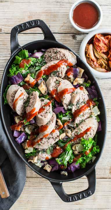 TO MAKE: Boil the brats for 10 minutes, then slice them. Heat the ghee in a large skillet or stockpot over medium-high heat. Add the mushrooms, onion, and sliced brats and sauce until the mushrooms are soft and the onions are translucent, 2 to 5 minutes. Add garlic and cook, stirring for 2 minutes. Add the cabbage and cook for 5 minutes more. Remove from the heat and stir in the mustard greens and oregano. Cover and let skillet sit for 2 minutes.