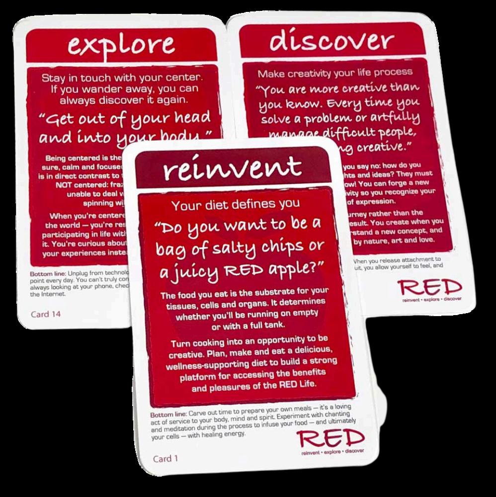 A wonderful way to begin your RED journey is with the exclusive RED Card Deck Based on my medical knowledge, philosophy and experience working with amazing women like you, the RED deck is essential for starting your transformation