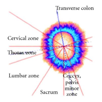 Another way to measure energy flow within the body and the vitality of that energy system is using electrical discharge photography popularly known as Kirlian photography, or GDV (Gas Discharge Visualization). (Kostyuk) The image below Figure 1 is from the second finger of the right hand and shows respective lumbar and thorax zones.