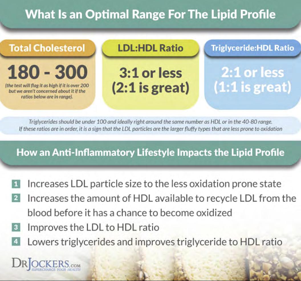 Having a balanced ratio of LDL to HDL and triglycerides to HDL is essential for your health. Ideally, we are looking for an LDL: HDL ratio: 3:1 or less, 2:1 being optimal. As we analyze triglycerides, we want them to be under 100 and we are looking for the Tri:HDL ratio to be 2:1 or less, 1:1 being optimal. Higher rates may indicate insulin resistance and inflammation. Optimal levels
