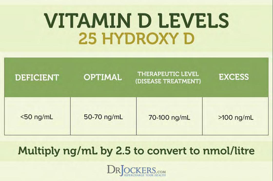 Optimal healthy levels of vitamin D are between 50 ng/mL and 70 ng/ mL, while therapeutic levels are over 70 ng/mL up to 100 ng/mL