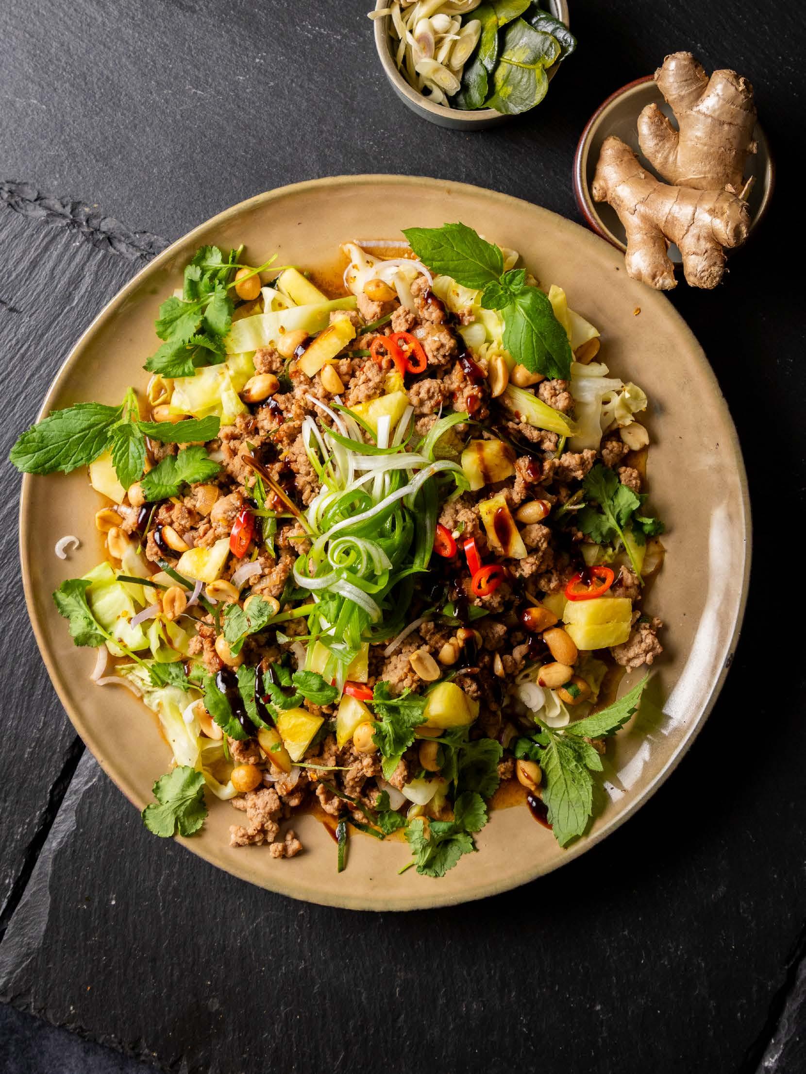 • Anret kålen på et fad, og fordel det lune kød over salaten. Drys med ananas og peanuts.