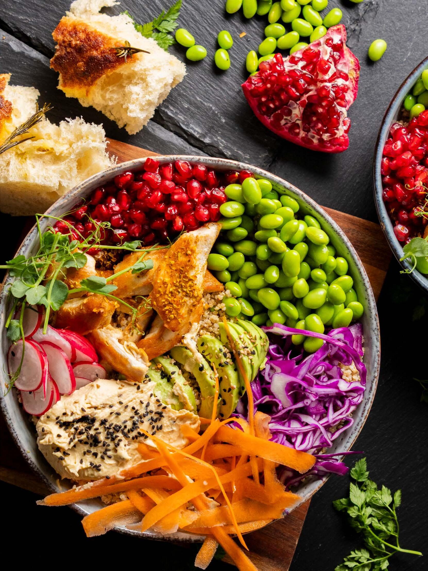 • Anret i 4 skåle: Kogt quinoa, spidskål, bønner, granatæblekerner, avocado, radiser, gulerødder og det stegte kylling samt en skefuld hummusdressing.