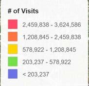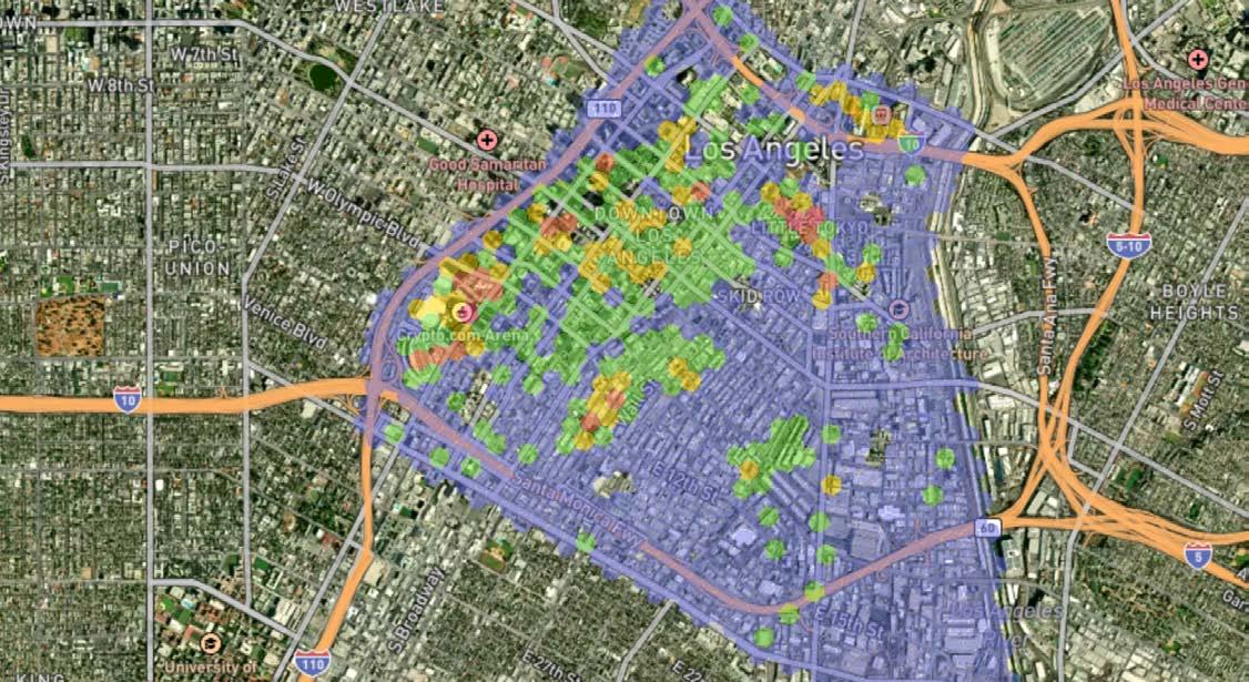 This heat map shows the most popular locations for DTLA’s 18+ million visitors in 2024. Several noteworthy areas, identified in dark yellow, had over 500K visits during the year, while the top three locations in red each saw over 2.5M visits.