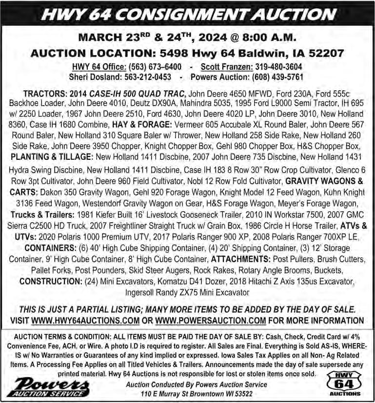 Sat., & Sun., March 23 & 24 @ 8am; Hwy. 64 Consignment Auction, 5498 Hwy 64, Baldwin, IA. Tractors, farm equipment, trucks, trailers, ATVs, UTVs, shipping containers, construction equipment and more!! Powers Auction Service. Scott Franzen 319-480-3604.