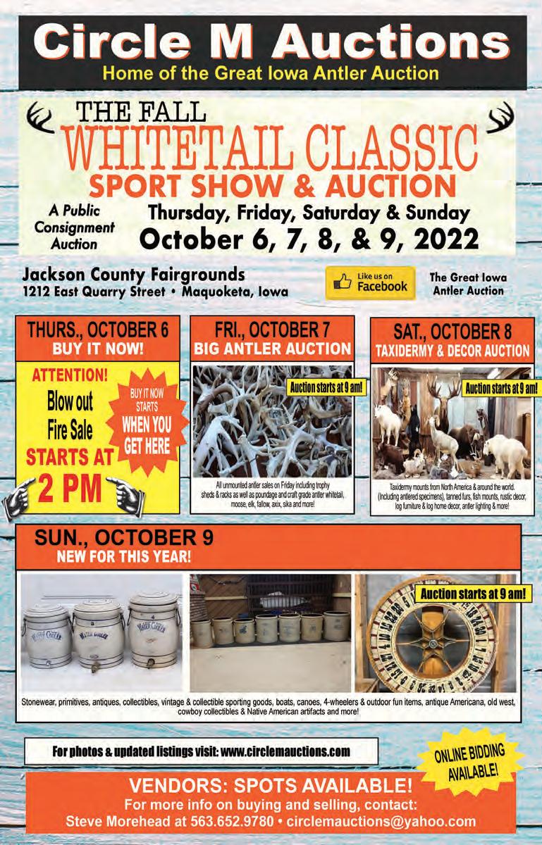 Fall Whitetail Classic Sport Show & Auction, Thurs. thru Sun., Oct. 6, 7, 8 & 9. Jackson Co. Fairgrounds, Maquoketa, IA. Public consignment auction. Great Iowa Antler Auction. Taxidermy, Stonewear, Primitives, Collectibles, Boats, Canoes, ATVs, Outdoor items, Antique Americana, Old West, Native American & More. Live and Online Bidding. Circle M Auctions. 563-652-9780. www.circlemauctions.com