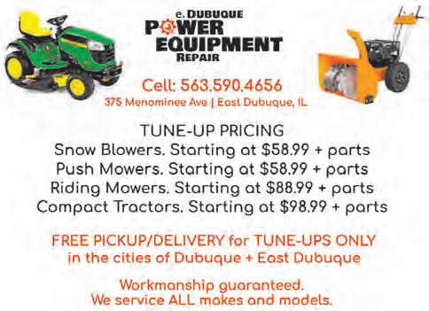EXCAVATING Bret Patterson 563-599-1010 Mini Excavator & Tracked Skidsteer General Excavation - Trenching Concrete Removal Yard Grading - Trucking Services Free Estimates Licensed & Insured Logan Keller 563-451-9516 Insured Free Estimates Commercial & Residential Decorative Stamping/Coloring Concrete Repair & Tear Out All Concrete Flatwork GUTTER Cleaning & Repair 563-581-0896 Free Estimates Quality Guaranteed • Gutter Guards • Storm Damage • New Installations • Rain Barrel Install • Drain Tiling MATT BREINER CONSTRUCTION Over 30 years experience. Licensed & Insured. Free Estimates. Call Matt 563-542-0266 • Kitchens • Garages • • Decks • Additions • • Bathrooms • • New Home Construction • • Interior Remodeling • G&R TREE SERVICE Trees Over Structures Excellent Clean-Up Stellar Reviews Cost-Effective Professional Fully Insured Greg: 563.580.8924 Ron: 563.663.2501 NOW BOOKING FOR 2023 Snowblowers Mowers Chippers/Shredders Chainsaws Leaf Blowers Log Splitters and More! 563-590-1973 Jerry Sigwarth Balltown, IA SALES & SERVICE • Pickup & Delivery Available •FREE In-shop Estimates PROPERTY RESCUE • TREE TRIMMING & REMOVAL • YARD CLEAN UPS • CLUTTER REMOVAL • SHRUB & HEDGE TRIMMING • MULCH INSTALLATION • GUTTER CLEANING • BRUSH PILE REMOVAL OPEN 7 DAYS A WEEK! LICENSED & INSURED 563-552-9850 Serving the Tri-State Area: Iowa-IllinoisWisconsin SPRING-SUMMER-FALL • Retaining Walls • Plantings • Rock • Mulch • Edging • Skid Loader Service • Lawn Mowing • Fertilizer + Weed Control Call EXPERT LAWN + SNOW: 563.580.1130 WINTER Commercial Snow Removal CONSTRUCTION “The contractor you can trust!” Residential/Commercial Licensed & Insured! New Home Construction Remodeling •Additions Decks • Windows • Doors Siding • Kitchens • Baths Handyman Repairs 563-213-7070 Call Today for a FREE ESTIMATE! 563-585-1111 www.iowaroofpros.com iowaroofguru@gmail.com FREE INSPECTIONS!! FREE ESTIMATES! Insurance Claims Welcome ROOFING • SIDING •GUTTERS JAMISON NIENKE Book Your Roof Replacement This Month and SAVE 10%!! Mention Code “SHOP23” NOW BOOKING SPRING 2023 SERVICES SERVICES OFFERED OFFERED ATTENTION BUSINESS OWNERS! Missed calls are missed leads. Never miss a call again with The Missed Call Text Back feature brought to you by Reachifii Business Solutions. Call us today at 563-564-0538! –––––––––––––––––––––––––––––––––AD SERVICE 563-588-0162 CLEAN & REPAIR IT ALL!! Attic, Basement, Garage & Estate cleaning. Remove & Haul Rubbish. Maid & Handyman. Licensed Plumber, Drain Cleaning. KANNDO 24/7. 563-556-6168 DENLOR PAINTING AND DECORATING Interior, Exterior Painting. Over 30 years experience. Quality work, Fair rates, Excellent references, insured, Free estimates, Ph. 563-588-2247 Fall lawn fertilization and weed treatments and seeding call or text 563-581-2907. Licensed and insured. HANDYMAN Carpentry, Drywall, Decks, Painting, Plumbing, Power Washing No Job Too Small! 563-580-7090 LICENSED ROOFER. Free Estimates on Roofing, Siding, Gutters. Text or call Jamison at 563-599-2684 Right-Way Hauling Trees and shrubs, yard waste, trash removal, metal, junk & more. Call: 563-582-8944 Top Soil. Pulverized & Delivered. 3 tons (3 cubic yards), $120. Dubuque area. 563-590-3964 –––––––––––––––––––––––––––––––––SELL THOSE UNWANTED ITEMS! Call Today! 563-588-0162 www.DubuqueToday.com Word Search Solution for puzzle on page 11