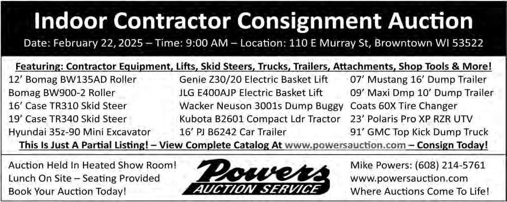 Sat., Feb. 22 @ 9am; Indoor Contractor Consignment Auction, 110 E. Murray St., Browntown, WI. Contractor equipment, lifts, skid steers, trucks, trailers, attachments, shop tools & more! Heated showroom, lunch on site. Powers Auction Service. www.powersaucttion.com 608-439-5764.