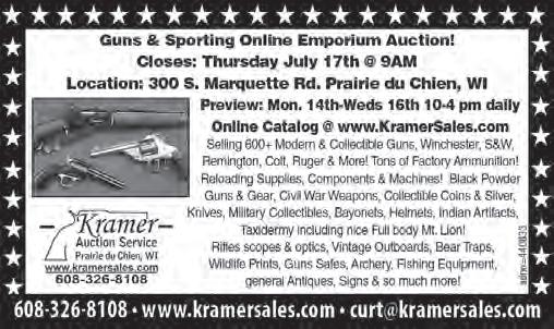 Kramer Auction Service. 1,700+ Lots of Guns & Vintage Sporting Goods. Online Catalog at www.kramersales.com Closes July 17th at 9 am. 300 S. Marquette, Prairie du Chien, WI. (mcn)
