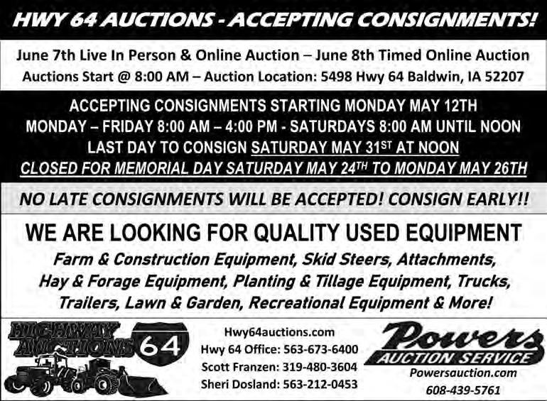 June 7 Timed Online Auction; June 8th Live In Person & Online Auction; Hwy. 64 Auctions - Accepting Consignments. 5498 Hwy 64, Baldwin, IA. Farm & construction equipment, skid steers, attachments, hay & forage equipment, planting & tilling equipment, trucks, trailers, lawn & garden, rec-