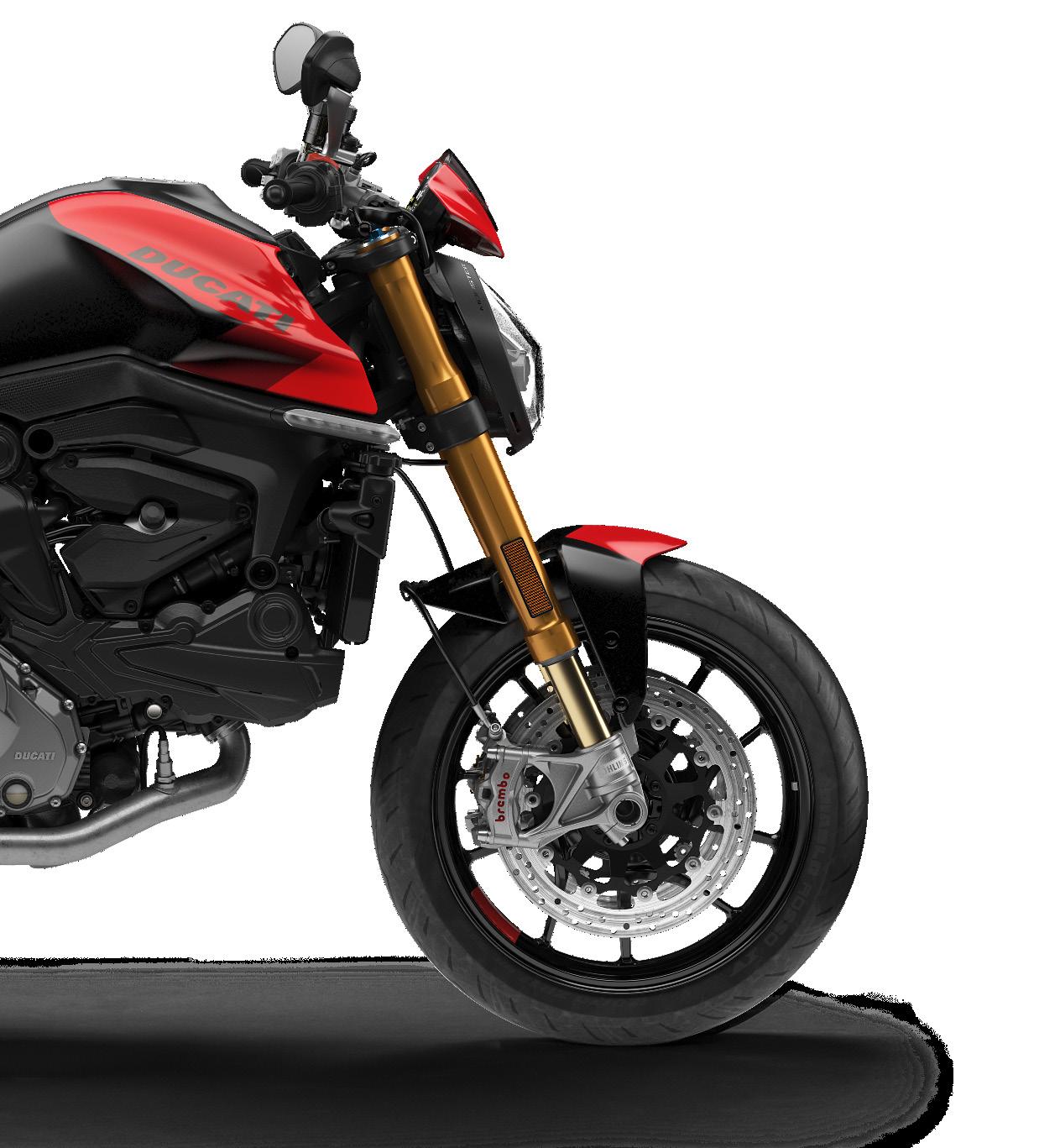 El Monster SP retoma los colores del 2022 de las Desmosedici GP del equipo oficial, lleva suspensiones Öhlins delante y detrás y el silenciador homologado Termignoni, las pinzas delanteras Brembo Stylema® y los neumáticos Pirelli Diablo Rosso IV. El amortiguador de dirección mejora la estabilidad en aceleración y el trazado de la curva, mientras que la configuración más ligera de la moto pasa también por la adopción de una batería de iones de litio, que conlleva una reducción del peso en orden de marcha de aproximadamente 2 kg respecto al modelo estándar.