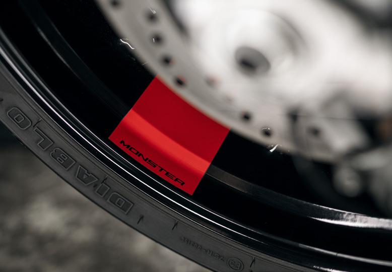 También las llantas, 1,7 kg menos pesadas, contribuyen a la ligereza global del Monster. Fabricadas en aleación ligera, miden 3,5” x 17” y 5,5” x 17” y montan neumáticos Pirelli Diablo Rosso III 120/70 delante y 180/55 detrás, que secundan la deportividad del Monster tanto en seco como en mojado y ofrecen el máximo agarre al tumbar la moto.