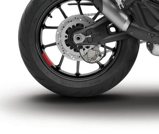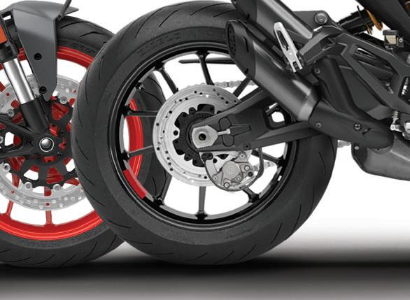Também as jantes, 1,7 kg mais leves, contribuem para a leveza geral da Monster. Fabricadas em liga leve, medem 3,5” × 17” e 5,5” × 17” e estão equipadas com pneus Pirelli Diablo Rosso III nos tamanhos 120/70 na dianteira e 180/55 na traseira, reforçando o carácter desportivo da Monster tanto em piso seco como molhado, e oferecem a máxima aderência nos ângulos de inclinação.