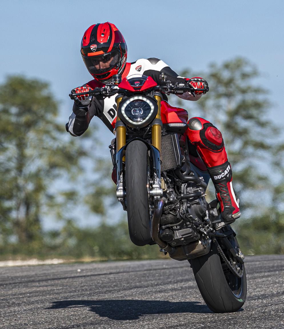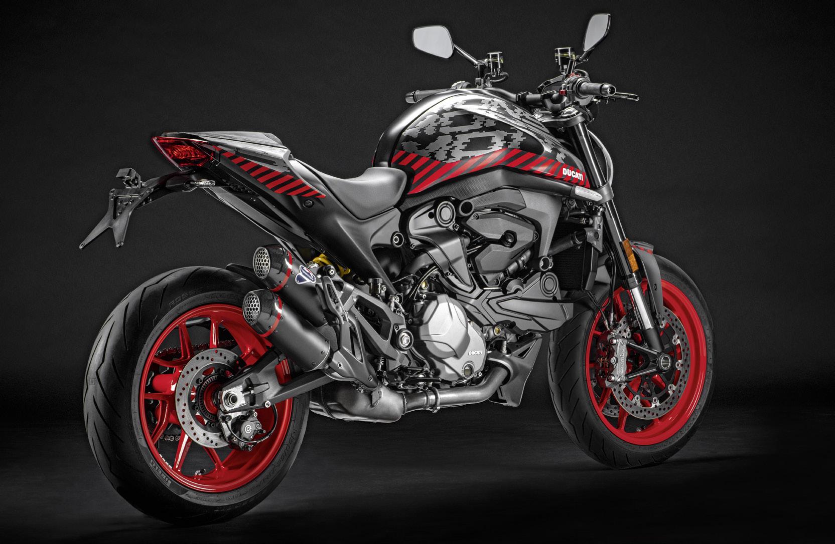 A Monster SP retoma as cores de 2022 da Desmosedici GP da equipa oficial, equipada com suspensões dianteiras e traseiras Öhlins e silenciador homologado Termignoni, pinças dianteiras Brembo Stylema® e pneus Pirelli Diablo Rosso IV.