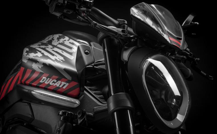 O farol full LED mantém a icónica forma circular da Monster, tornada ainda mais marcante e moderna pela assinatura luminosa da DRL, a luz diurna em forma de anel. A estrutura do farol também evolui graças a um elemento transparente que incorpora totalmente a parte ótica e a eletrónica. Elementos técnicos como o módulo central e o dissipador de calor, totalmente visíveis, criam uma mistura moderna e tecnológica.