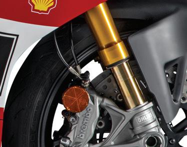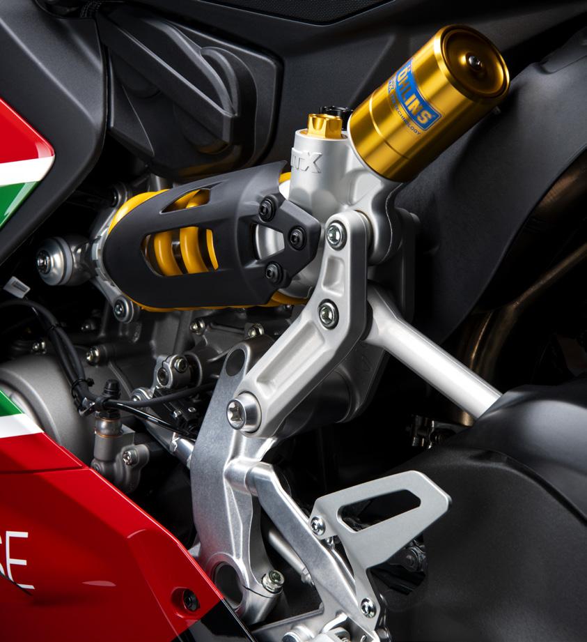 Para além das cores especiais, o espírito racing da Panigale V2 Bayliss 1st Championship 20th Anniversary é também expresso nos componentes Öhlins de alta qualidade. O garfo e o amortecedor traseiro proporcionam a máxima suavidade e foram concebidos para o melhor desempenho em circuito, com um alinhamento que torna a moto mais precisa e dá ao condutor uma maior sensação e apoio em todas as fases da condução. O amortecedor de direção, graças às regulações com que está equipado, permite que a sua calibração seja personalizada de acordo com o estilo de condução e as características do troço.