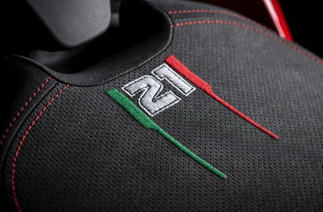 O design da Panigale V2 Bayliss 1st Championship 20th Anniversary é complementado pelos punhos desportivos, o silenciador final em fibra de carbono e titânio [QP1] [LE2] e o assento do condutor feito de materiais técnicos com bordado vermelho e costura dupla, que apresenta o número 21 e as cores da bandeira italiana.