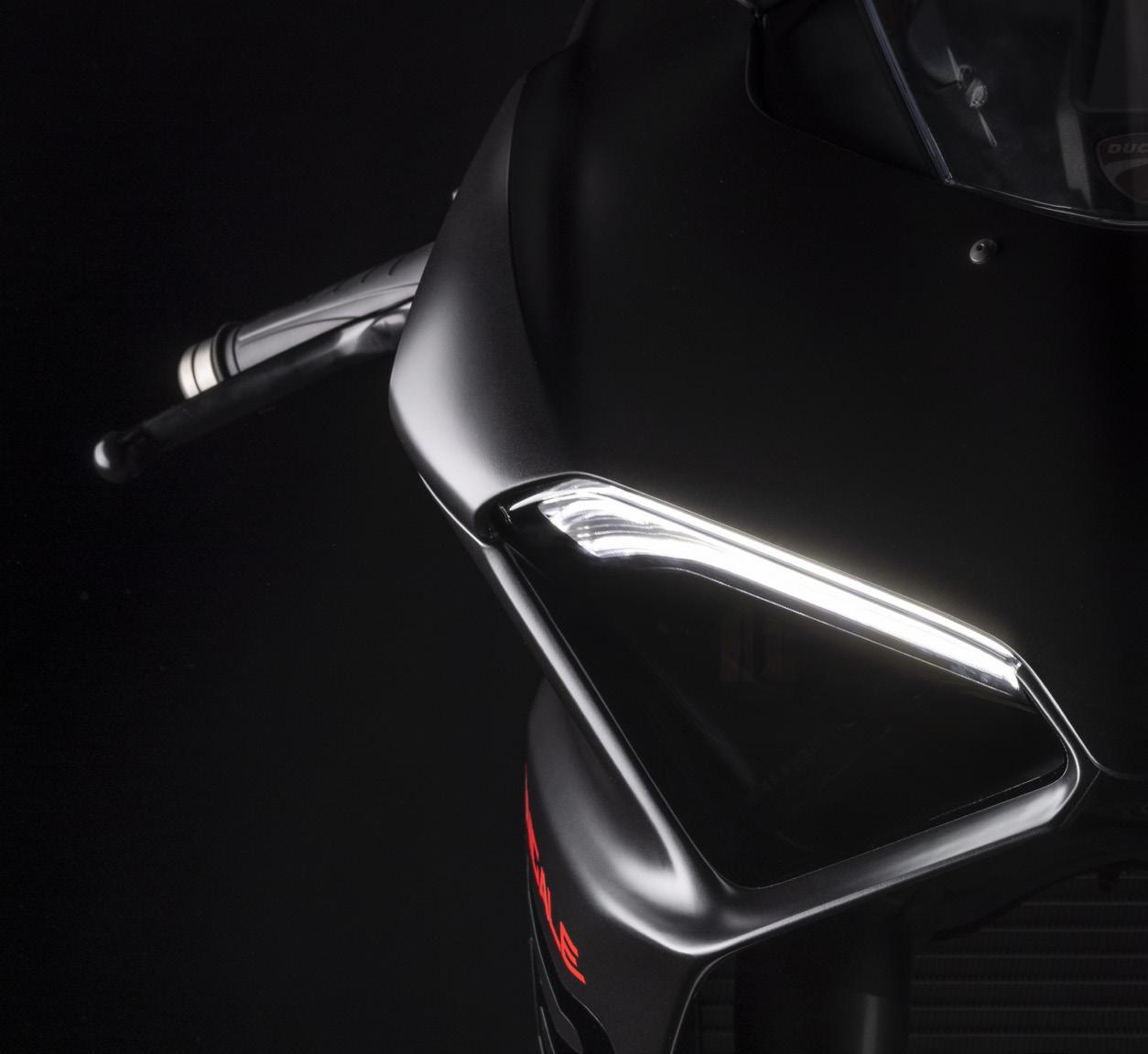 The front headlight assembly is extremely compact thanks to the adoption of two small LED low beam/high beam modules. The Daytime Running Light and V-shaped upper rim of the dual headlight assembly create a ‘browed’ look, the modern hallmark of Ducati sports bikes.