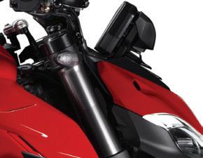 Su grupo óptico compacto delantero se aloja en un carenado de doble capa, con un diseño especialmente cuidado, en el que están realizadas las tomas de aire del air-box y de refrigeración de las unidades LED, mientras que un deflector trasero evita que el flujo impacte directamente sobre el depósito. El faro está coronado por el salpicadero TFT de 5” (el mismo de la Panigale V4) integrado con una sofisticada cubierta frontal que oculta elegantemente las fijaciones y el cableado.