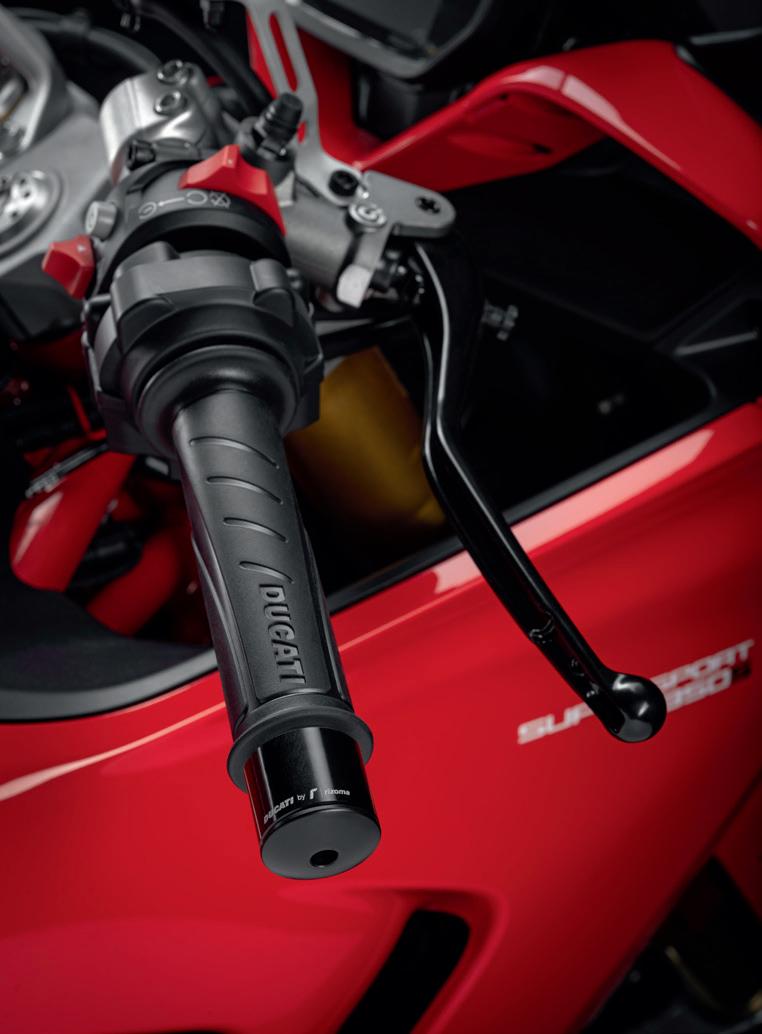 O painel de instrumentos da família SuperSport 950 apresenta um visor full TFT de 4,3”. Os gráficos e a interface, inspirados no da família Panigale, facilitam a navegação no menu, o ajuste das definições e permitem a identificação mais rápida do Riding Mode selecionado. A interface de regulação dos Riding Modes permite visualizar imediatamente e de forma clara a intervenção nas definições graças a gráficos explicativos do sistema em que se está a intervir e a uma escala graduada que indica se a alteração está mais orientada para a performance ou para a segurança/ estabilidade do veículo.
