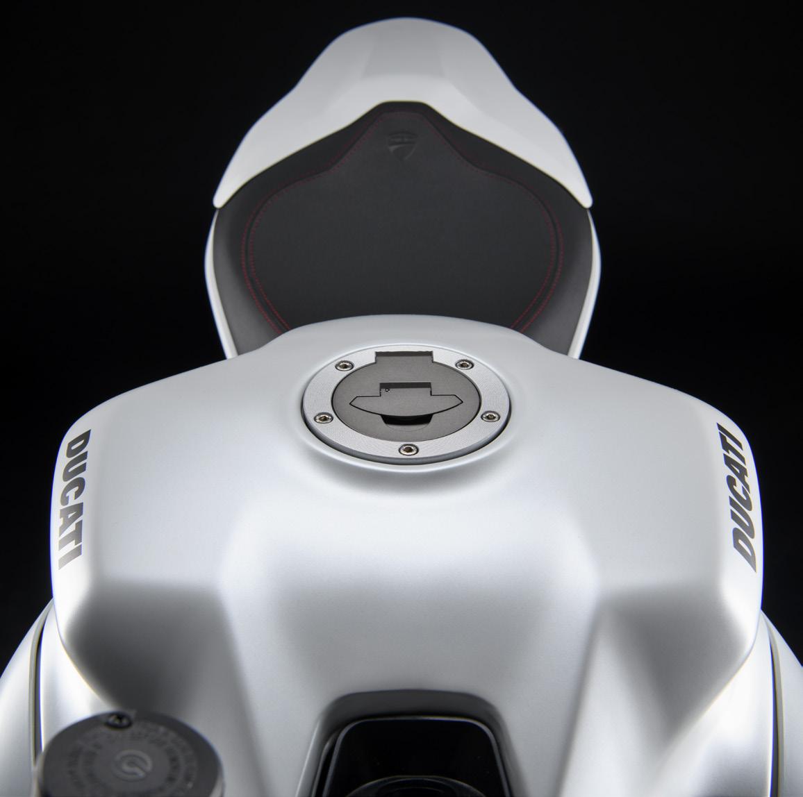 A secção do assento para o passageiro está bem distanciada dos pousa-pés e está adequadamente acolchoada. Para aumentar o conforto, poderá optar na gama de acessórios Ducati Performance por um assento com mais estofo (+25 mm) para condutor e passageiro, adequado para viagens mais longas, e pegas de apoio do passageiro externas, que proporcionam uma preensão mais ergonómica do que as de série integradas sob o assento.