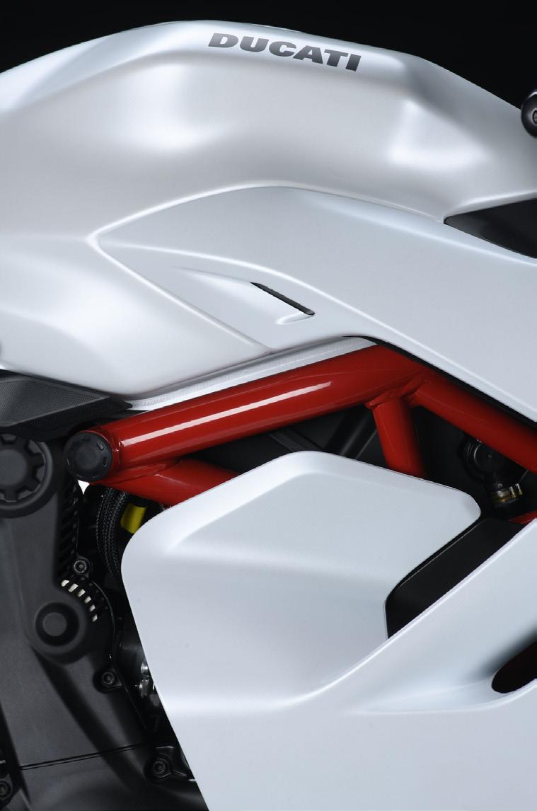 cabeças dos cilindros, enquanto o suporte do quadro traseiro do assento, também em aço, é fixado à cabeça do cilindro vertical. Esta configuração proporciona um quadro muito compacto, leve e com alta rigidez torcional, perfeito para melhorar as qualidades dinâmicas da SuperSport 950.