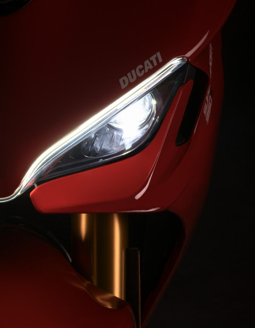 A vista frontal é dominada pelo novo farol full LED com luz diurna, Daytime Running Light (DRL), que evoca claramente a assinatura luminosa e incisiva da Panigale V4. A DRL foi concebida com o maior cuidado a fim de difundir a luz de forma ampla e homogénea, mas também em relação ao design. O farol é complementado por dois módulos LED bifunção para máximos e médios que conferem um “rosto” simétrico à moto quando as luzes estão acesas. Os dois módulos são embelezados por uma moldura de acabamento brilhante.