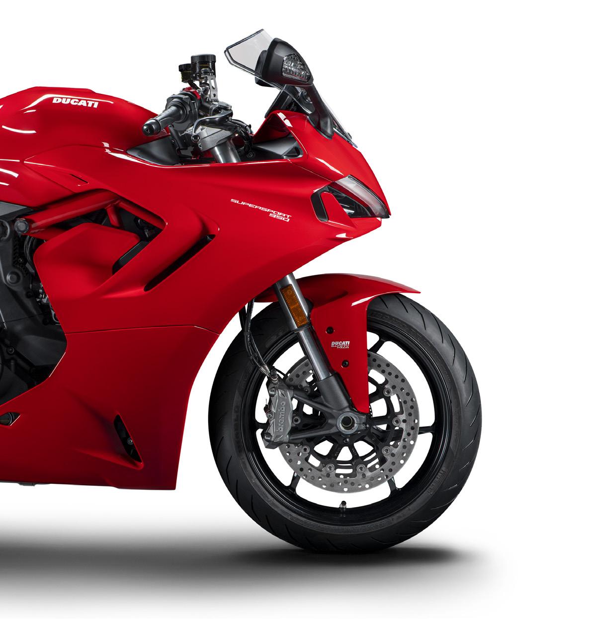La SuperSport 950, gracias a su carenado, adquiere más deportividad y fluidez de formas, así como una fuerte y decidida referencia a la firma luminosa de la Panigale V4 gracias al faro full-LED y a las nuevas salidas de aire laterales.
