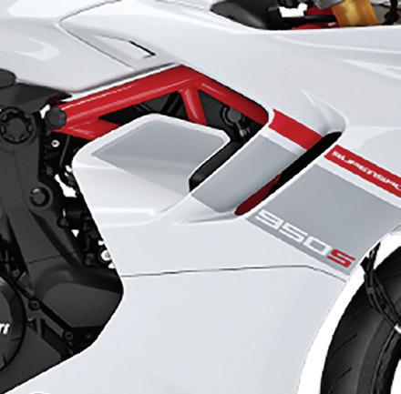 La vista lateral se enriquece con unos elegantes respiraderos para el aire caliente procedente del radiador de agua que recuerdan al doble extractor de los modelos Panigale V4. Los extractores traseros también actúan como tapa estética y se cierran alrededor del bastidor quedando ajustados para acentuar la sensación de moto estrecha en los laterales. El carenado inferior se prolonga ahora hasta el silenciador lateral, ocultando los componentes mecánicos y evocando visualmente a las motos de pista.