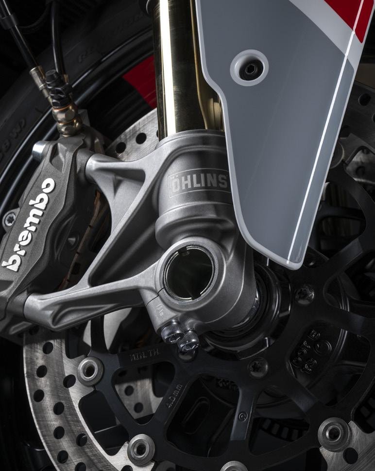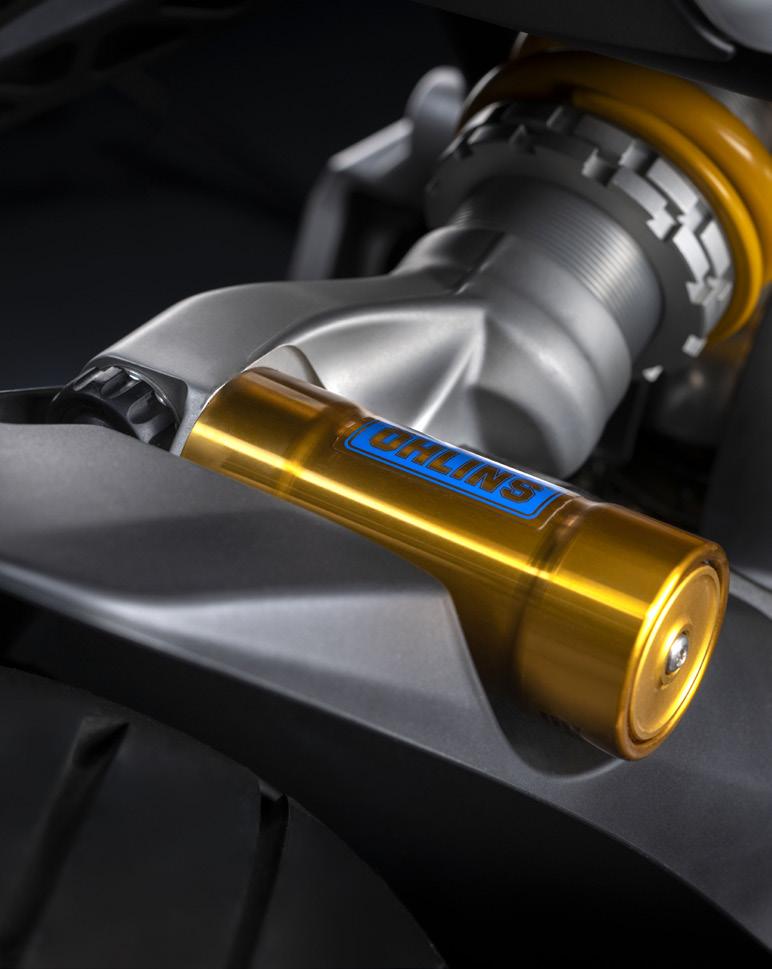 El equipamiento de ambas versiones se puede completar con el amortiguador de dirección Öhlins regulable, disponible come accesorio Ducati Performance.