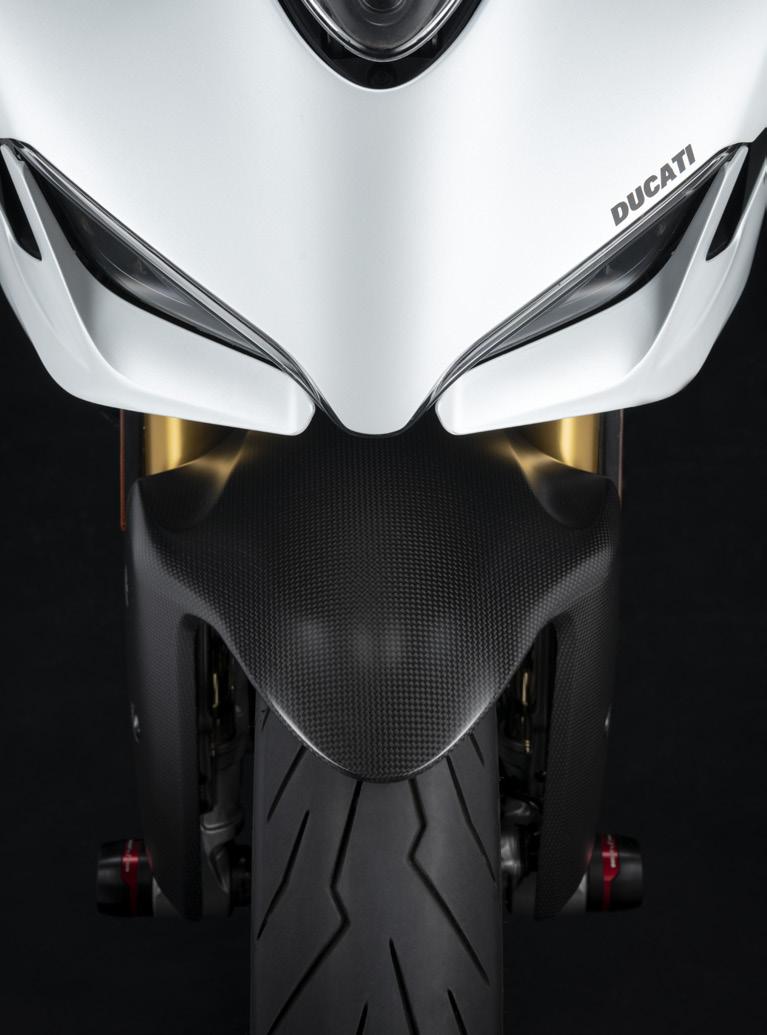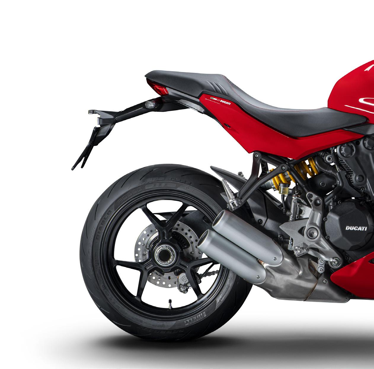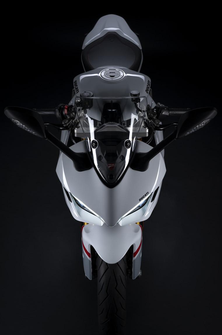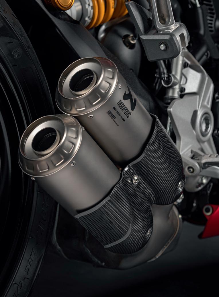 La vista laterale è arricchita da eleganti sfoghi per l’aria calda proveniente dal radiatore dell’acqua che ricordano il doppio estratore dei modelli Panigale V4. Gli estrattori posteriormente fungono anche da cover estetica e si richiudono sul telaio rimanendo aderenti per accentuare la sensazione di moto stretta sui fianchi. La carena inferiore si estende ora fino al silenziatore laterale celando la meccanica e ricordando visivamente le moto da pista.