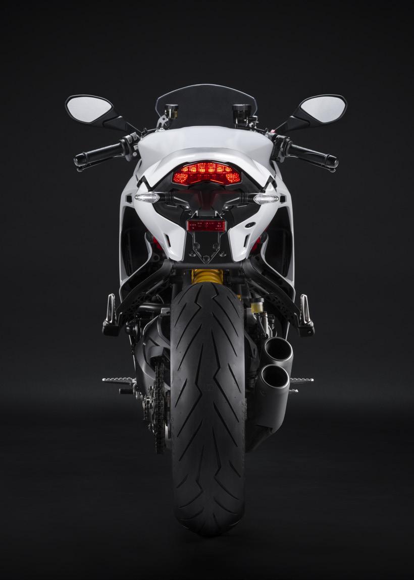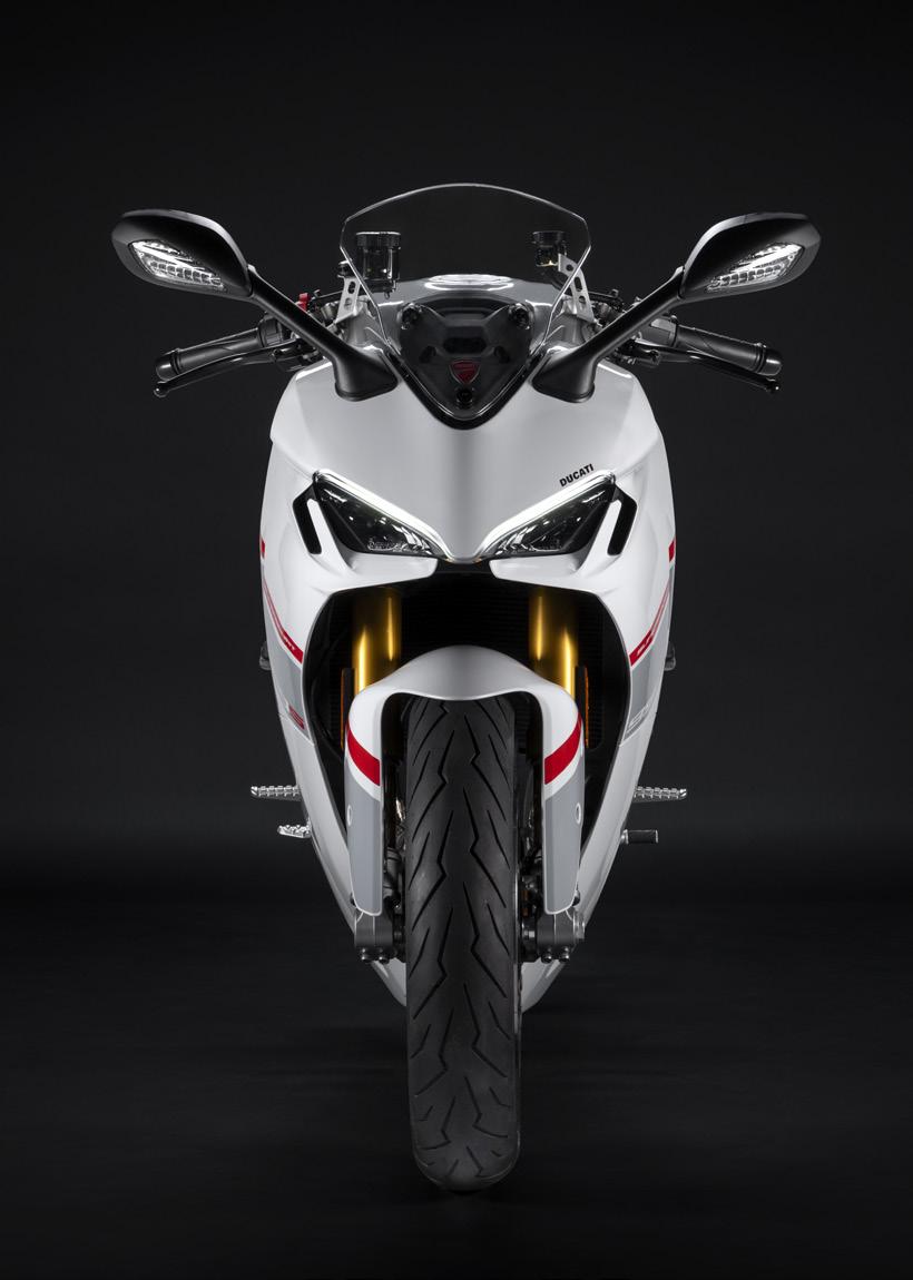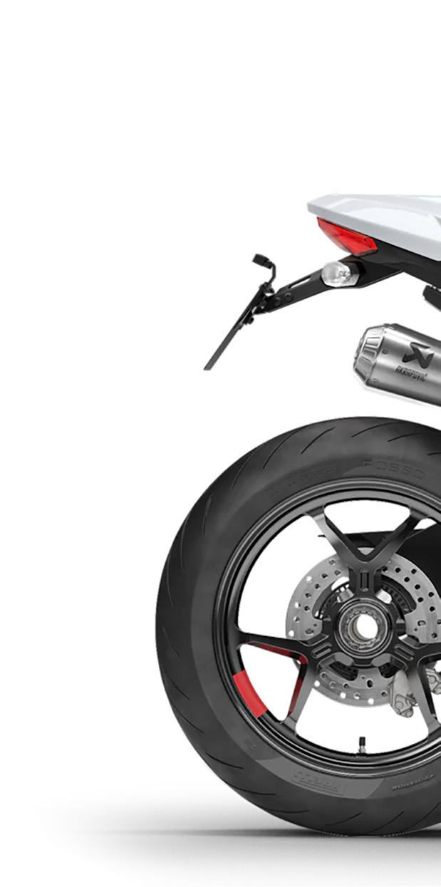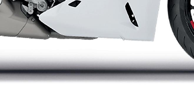 La vista laterale è arricchita da eleganti sfoghi per l’aria calda proveniente dal radiatore dell’acqua che ricordano il doppio estratore dei modelli Panigale V4. Gli estrattori posteriormente fungono anche da cover estetica e si richiudono sul telaio rimanendo aderenti per accentuare la sensazione di moto stretta sui fianchi. La carena inferiore si estende ora fino al silenziatore laterale celando la meccanica e ricordando visivamente le moto da pista.