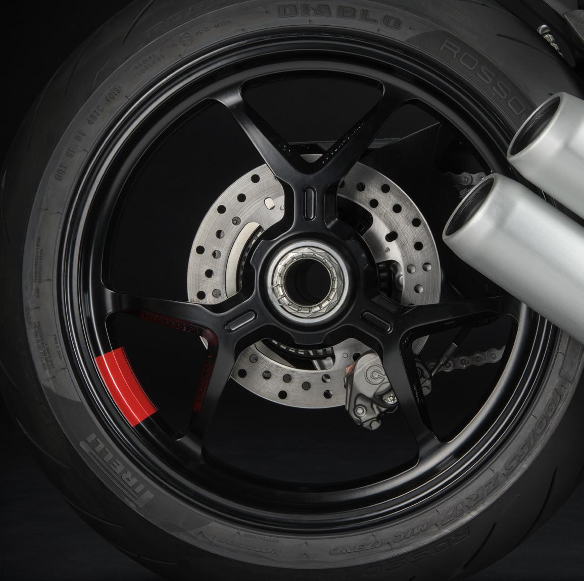 La sportività della SuperSport 950 è messa in risalto dal design dei cerchi in alluminio, a tre razze a “Y”, nelle misure 3.50 x 17 all’anteriore e da 5.50 x 17 al posteriore. I pneumatici, Pirelli Diablo Rosso® III, sono della misura 120/70 ZR 17 all’anteriore e 180/55 ZR 17 al posteriore. I cerchi della SuperSport 950 S sono impreziositi dai “tag” di colore rosso.