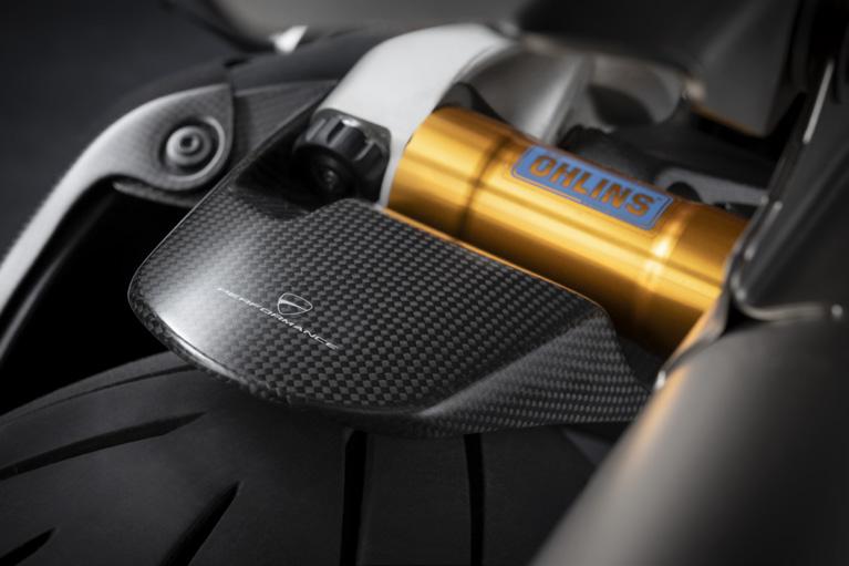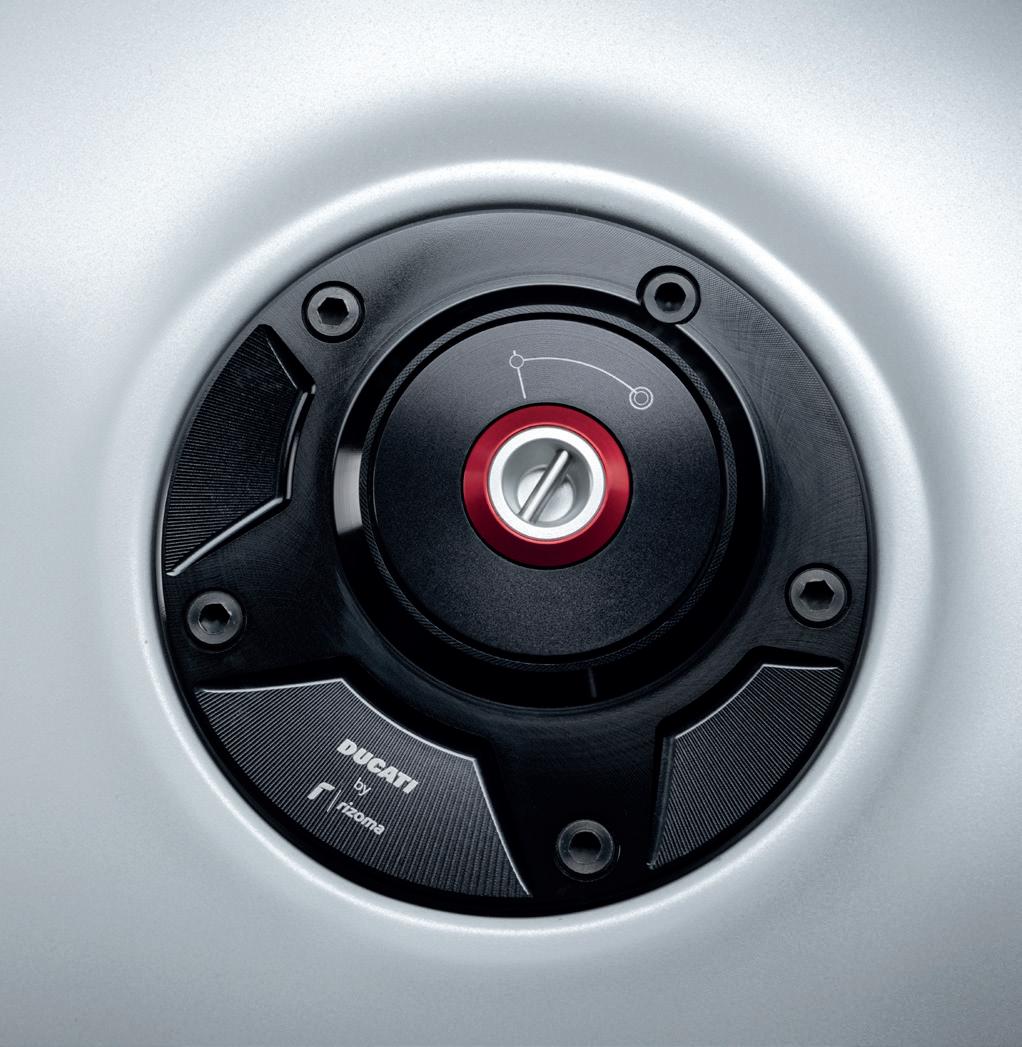 L’equipaggiamento ciclistico di entrambe le versioni può essere completato con l’ammortizzatore di sterzo Öhlins regolabile, disponibile come accessorio Ducati Performance.