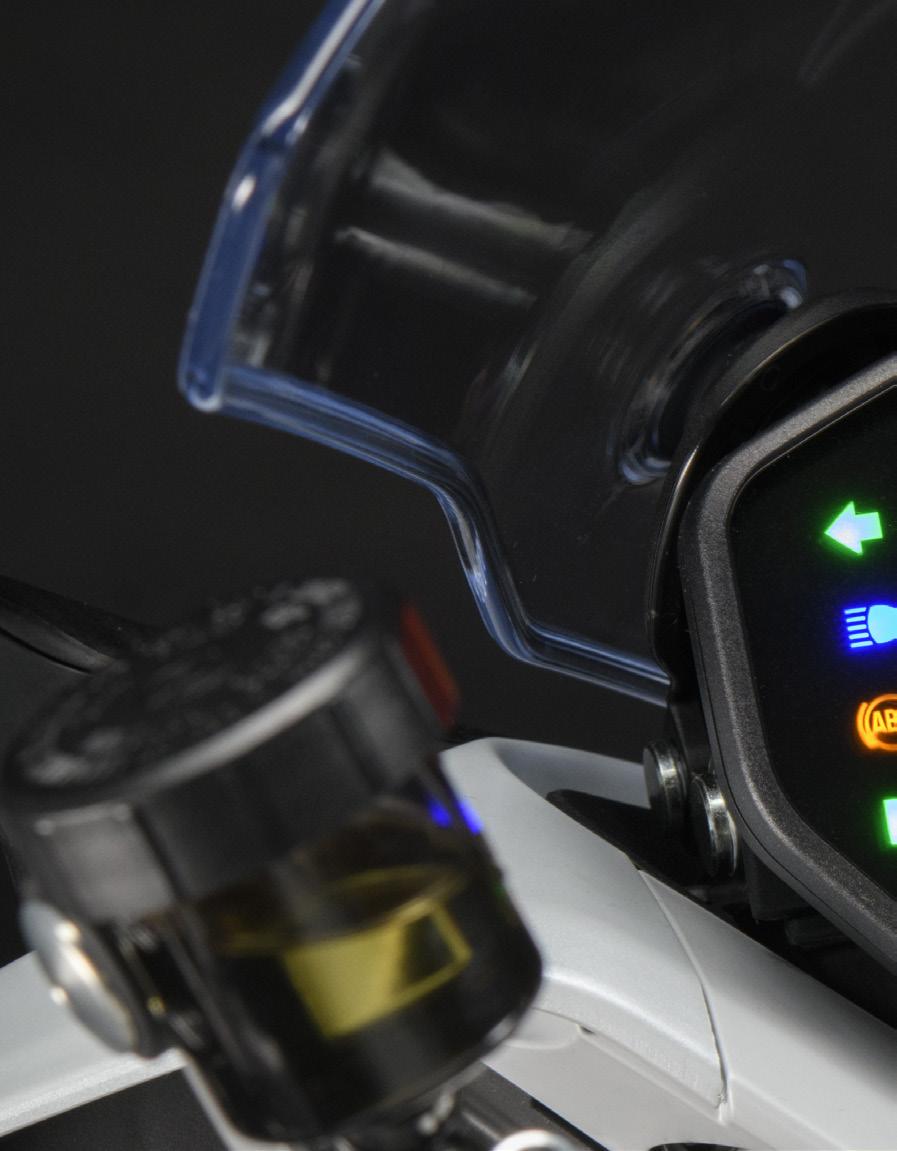 permette di passare da un livello all’altro selezionando il Riding Mode desiderato per avere il settaggio ottimale in qualsiasi condizioni di guida. Il livello 1 è raccomandato per superfici ad alta aderenza, in questa configurazione l’ABS Bosch offre prestazioni da pista, interviene solo sull’anteriore con funzionalità cornering non attiva e non prevede l’attivazione della funzione antisollevamento del posteriore; il livello 1 di default non è abbinato a nessun Riding Mode, se il pilota lo desidera lo può associare al Riding Mode che preferisce entrando nello specifico menu. Con il livello 2 l’ABS Bosch è attivo anche sulla ruota posteriore e si abilita il controllo dell’anti- sollevamento. Il livello 3, consigliato quando piove o per superfici a bassa aderenza, corrisponde al massimo grado di intervento sulla frenata e sul sollevamento del posteriore.