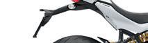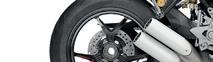 Il silenziatore laterale è compatto, a due uscite sovrapposte, la sua forma e la posizione bassa esaltano il dinamismo della coda, lasciando completamente a vista il disegno a “Y” delle razze del cerchio posteriore, impreziosito come quello anteriore.