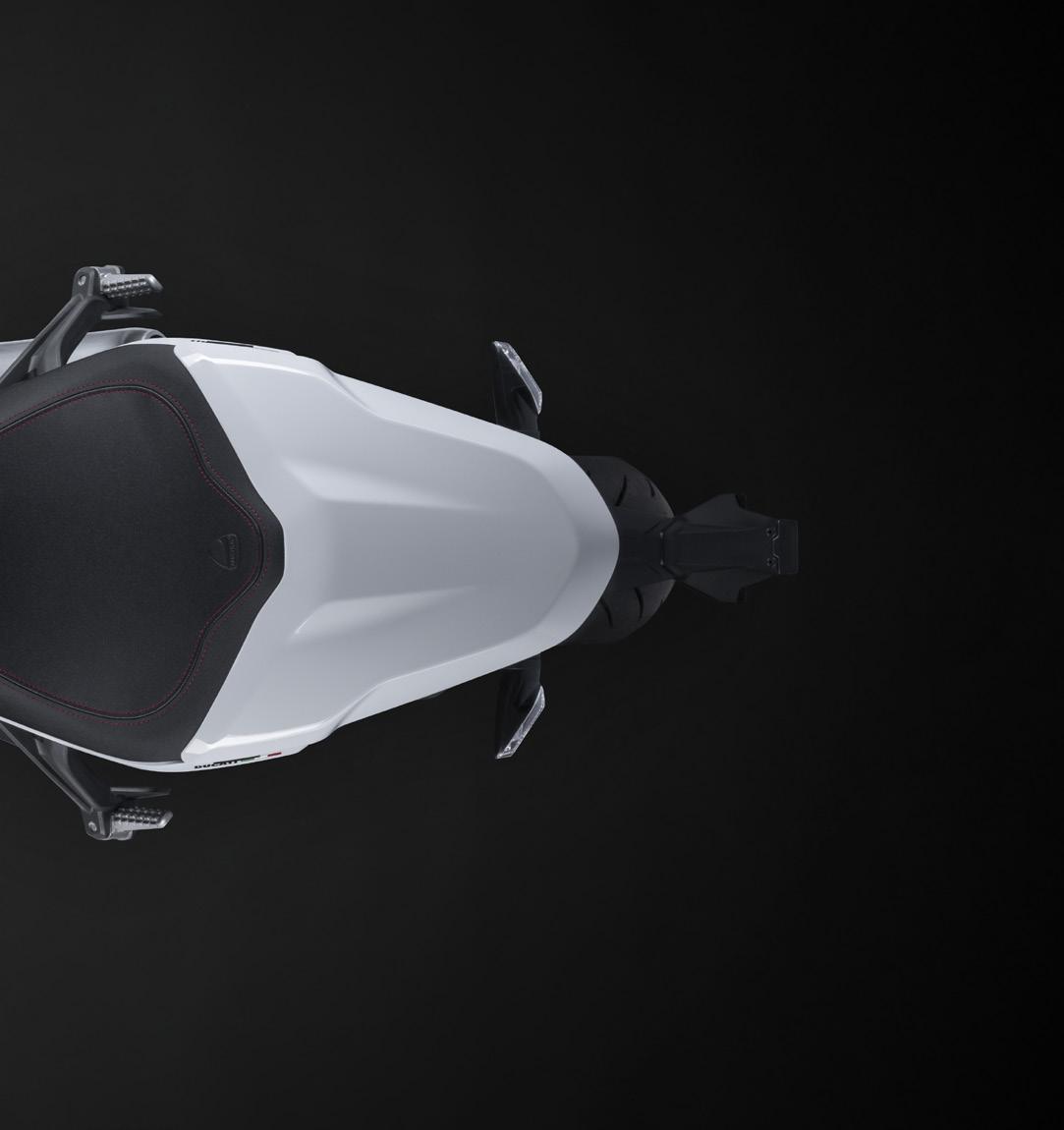 La porzione di sella riservata al passeggero è ben distanziata dalle pedane ed è adeguatamente imbottita. Per aumentare il comfort è possibile scegliere dalla gamma accessori Ducati Performance una sella con maggiore