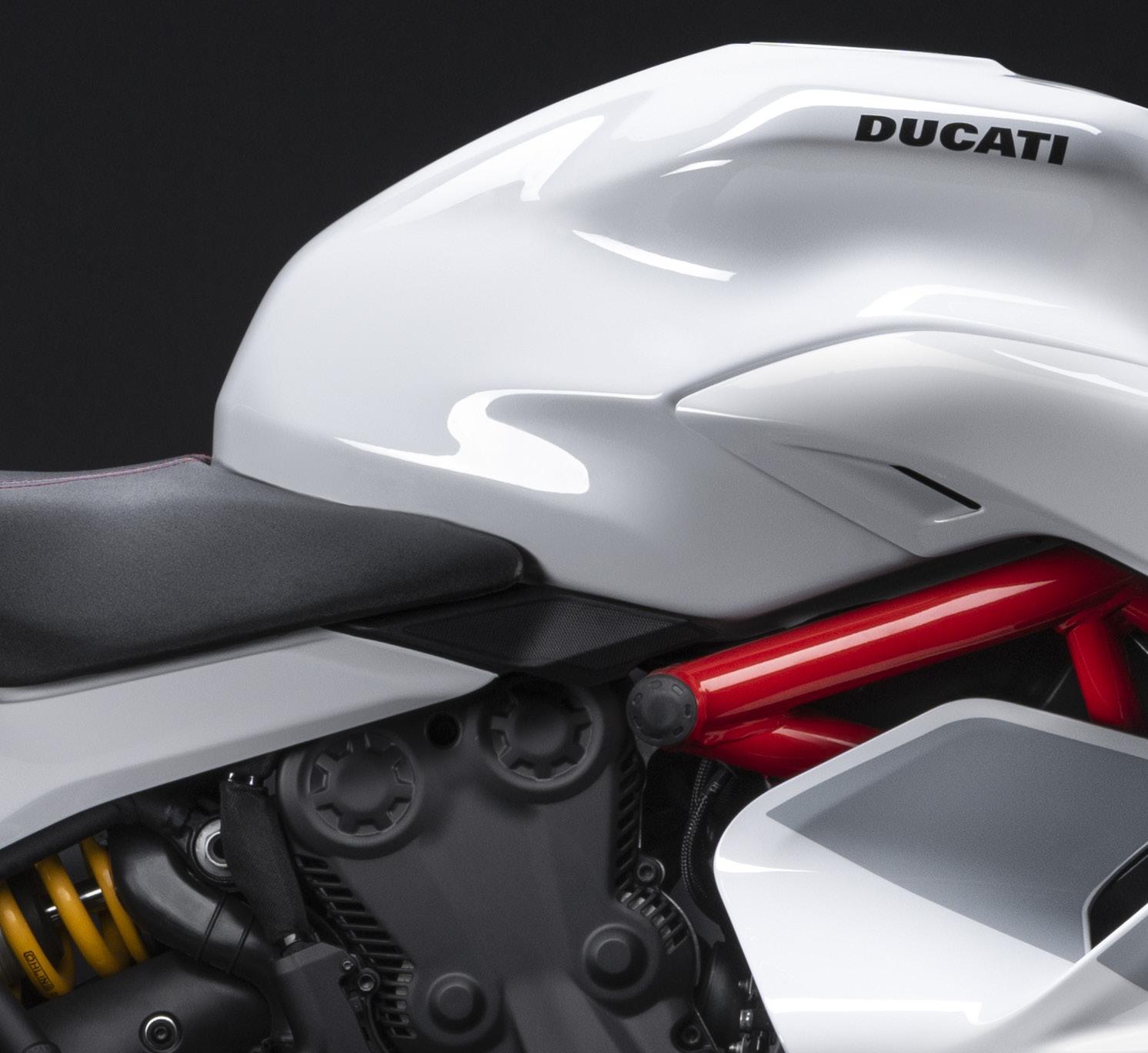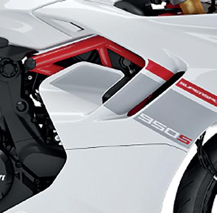 La vista laterale della SuperSport 950 è segnata da sfoghi aria che ricordano il doppio estrattore dei modelli Panigale V4. La carena inferiore si estende ora fino al silenziatore laterale, celando la meccanica e ricordando visivamente le moto da pista.