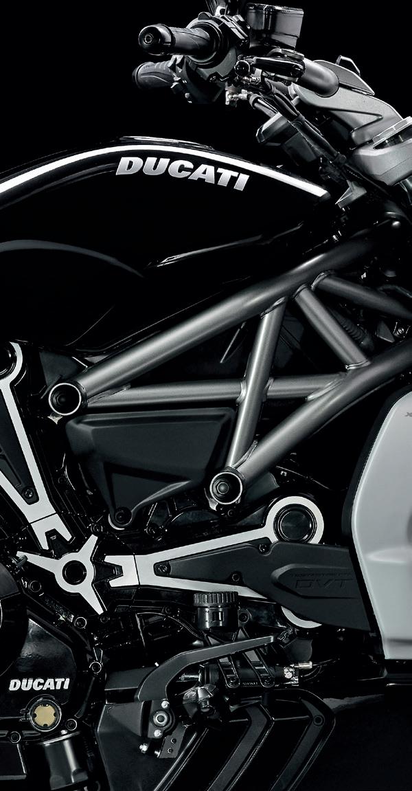 Single-sided swingarm. The singlesided swingarm of the XDiavel is created by combining three different technologies in the same component. The lower section is fused, while the upper comprises trellis piping and a removable forged element that allows for belt replacement.