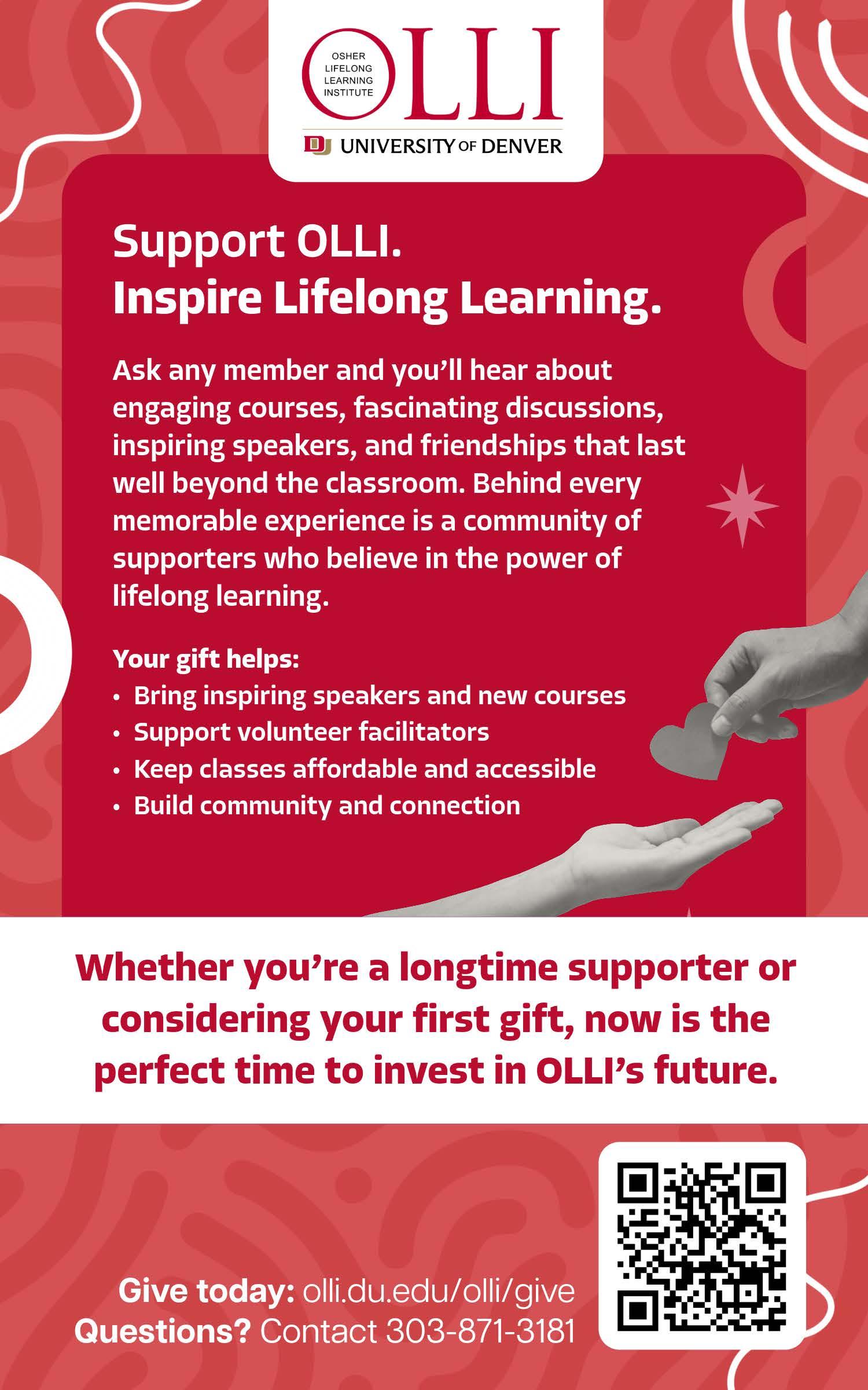 The Osher Lifelong Learning Institute at the University of Denver (OLLI at DU) offers a rich array of courses, lectures, webinars, and social and travel opportunities designed for adults 50+. With no tests and no grades, it’s learning purely for the love of it.