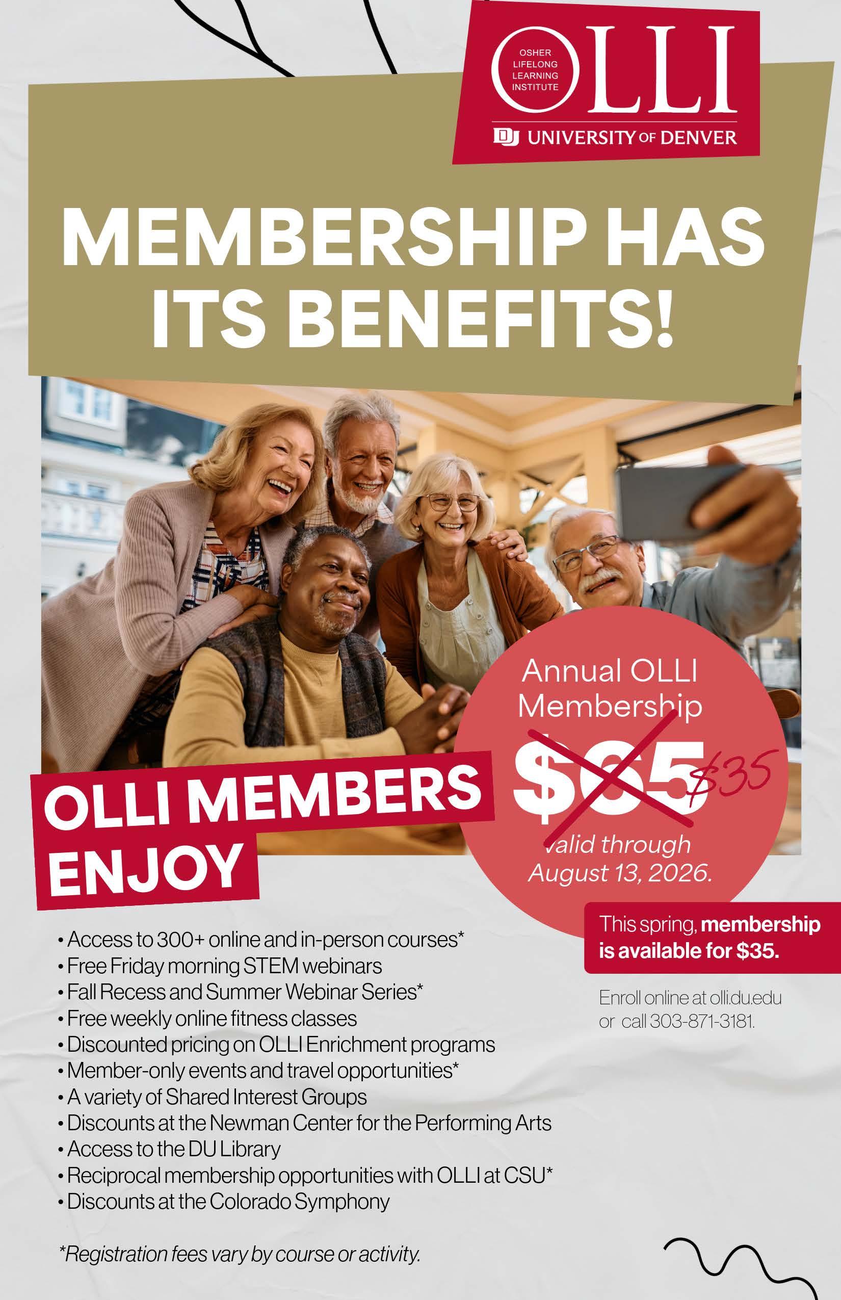 Still have questions or need help with registration or membership? Contact us by email at olli@du.edu or call our office at (303) 871-3181.